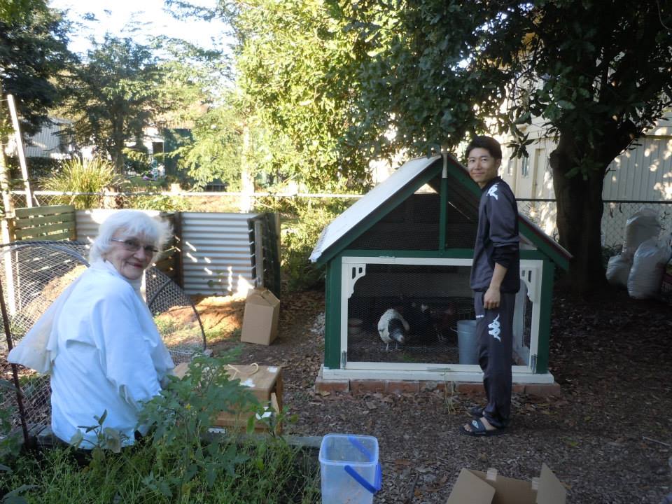 After months of planning, searching and building, we built a chicken coop/palace and a tractor for only $135. Thanks to HelpXers, neighbours, kerbside collection and recycling construction material from the house (saved for 2 years!). The hens are well provided for. Despite being confined, they appear content for now. The plan is to keep them until they stop laying then eat them.