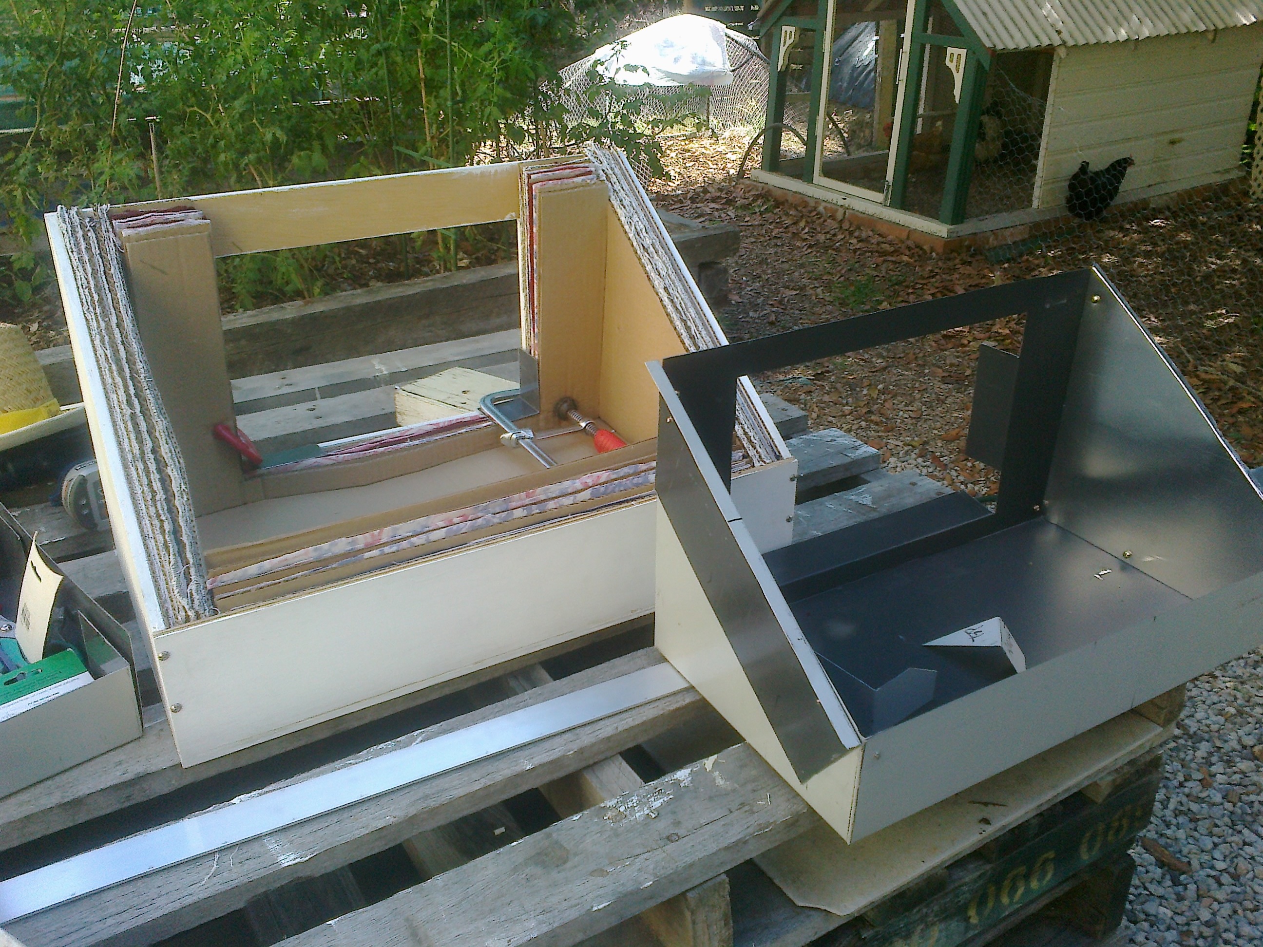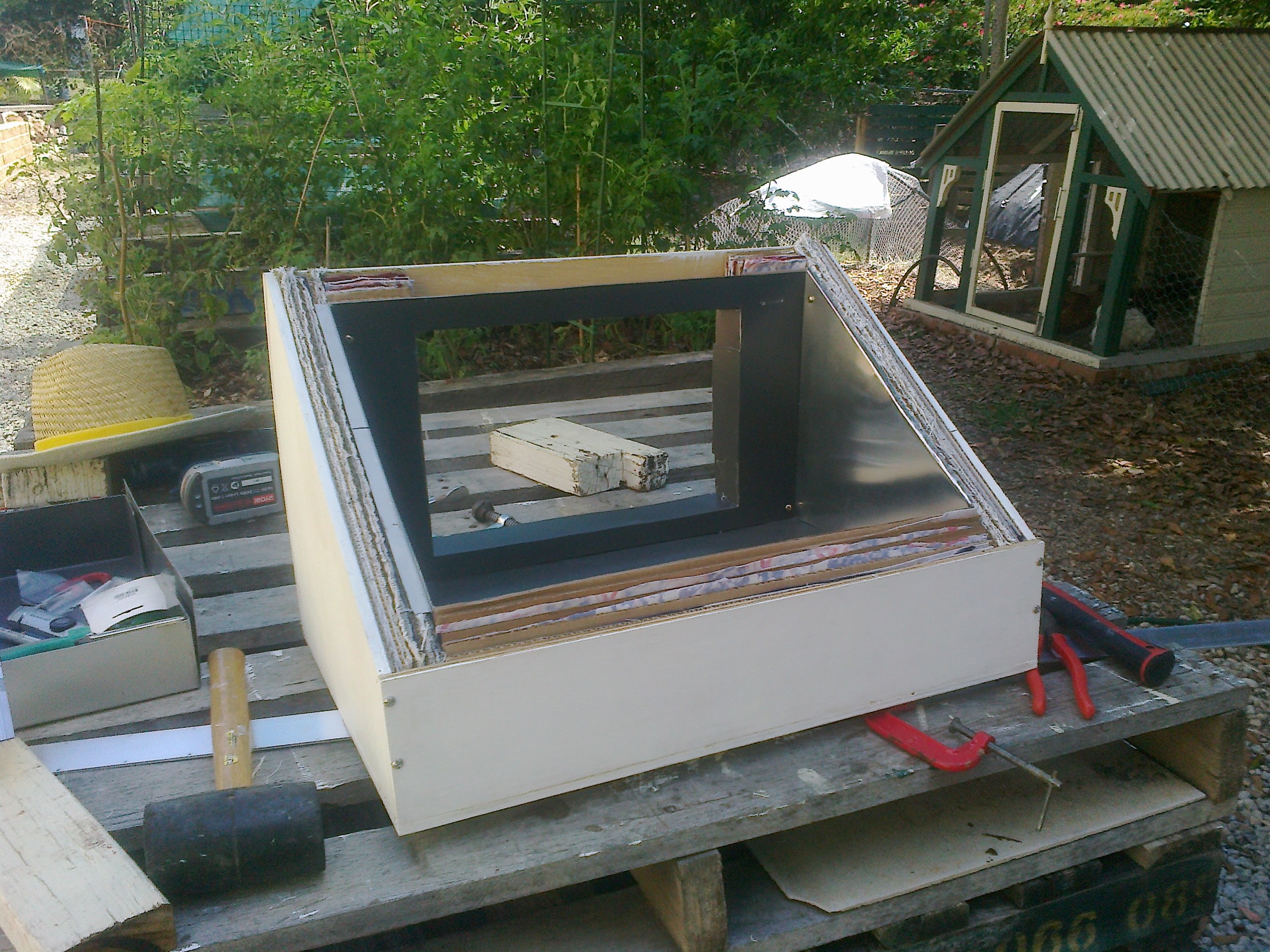 Starting with construction of a marine ply box with stainless steel screws, the face or top slopes downward to allow sunlight in. Then the box was lined with a 4 cm thick layer of cardboard, cotton and wool insulation. A tin and aluminium box made to size to fit inside was then constructed and painted with pot belly black heat resistance paint. Usually aluminium is used because it’s easy to work with, but I happened to find some tin roof flashing which was quite thin and flexible.