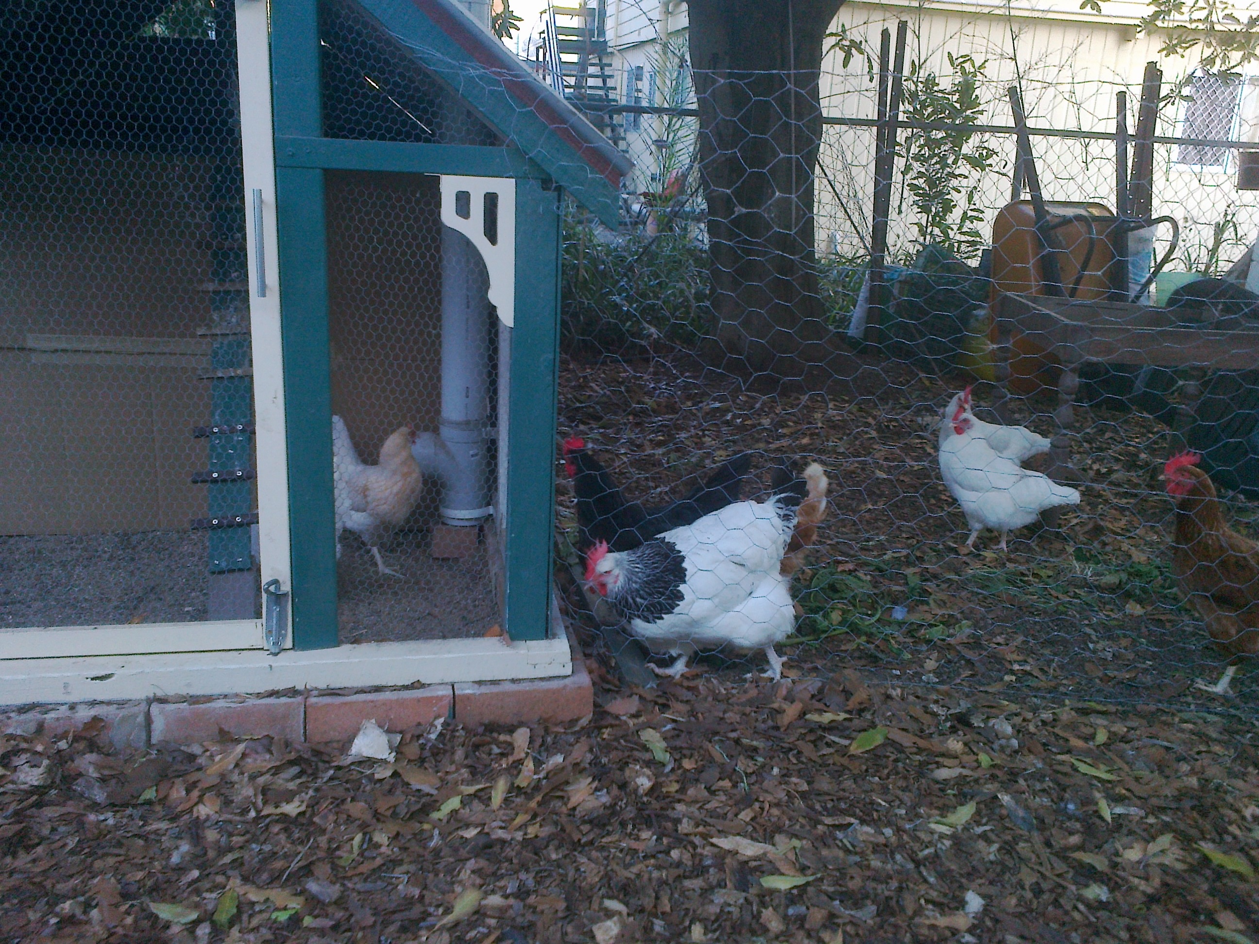 In September, our first Leghorns arrived because neighbours Glen and Kay asked for eggs, hence the name ‘Gay’ for one of them. We put them in the mix immediately – not knowing better – and the younger one got harrassed a lot, so she’s “Britney” – Leave Britney alone!!!! come the cries of Chris Crocker.