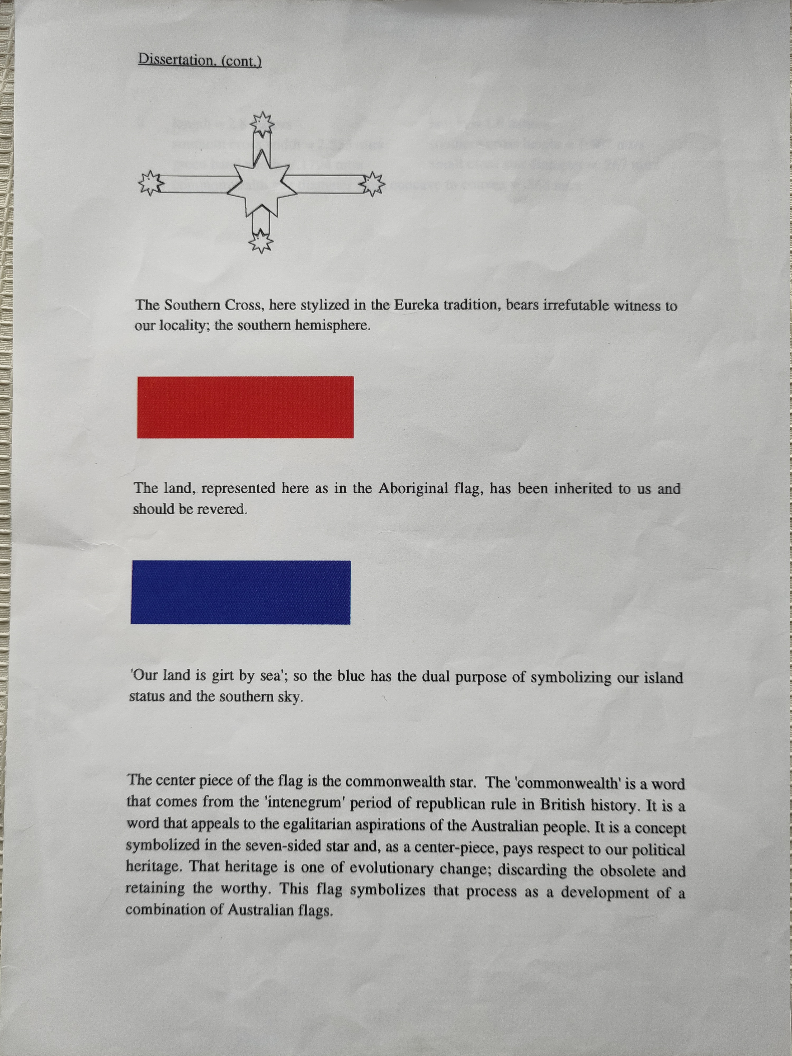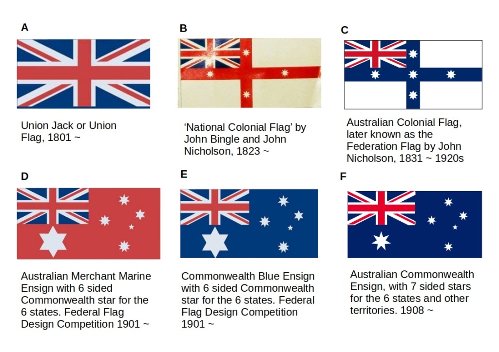 I subsequently learnt that Australians flew a Federation Flag (C, below) for nearly 100 years. It originates from an 1824 design by John Bingle and John Nicholson (B) with a stylized Southern Cross. The 1854 stylized Eureka Stockade cross bears a remarkable resemblance to it. Again, by delving into history, I was humbled to learn that the ‘republican’ flag had an earlier iteration. How many ardent republicans know this? How many know that in his diary, John Bingle, “claimed that this design … was accepted as the national colonial flag of Australia by the Government of Sir Thomas Brisbane.” (Department of PM and Cabinet)? Sir Thomas Brisbane was Governor of NSW at the time. Our first Prime Minister Edmund Barton submitted the blue version (C) to the British authorities in 1902 as an alternative to the design chosen for the Australian National Flag through the 1901 competition (E). See image C below: