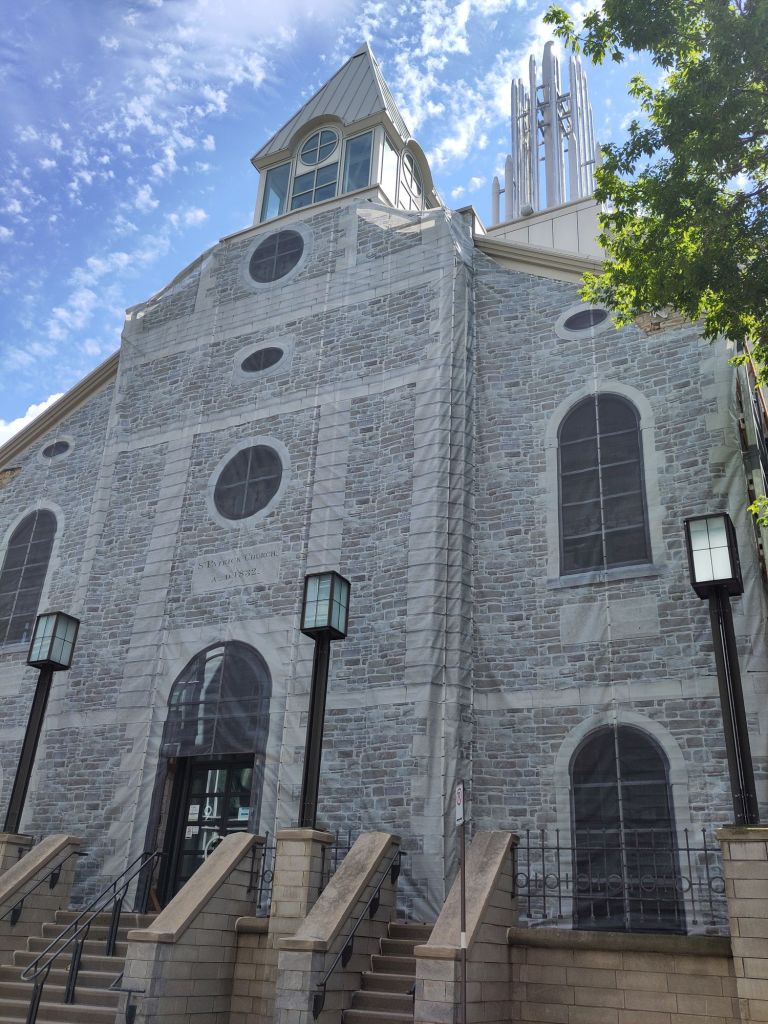 Appearances really matter here. This Irish church, which houses a modern research facility, was wrapped in a patterned canvas until its stone veneer could be replaced. Many renos in the city are pleasantly disguised this way.