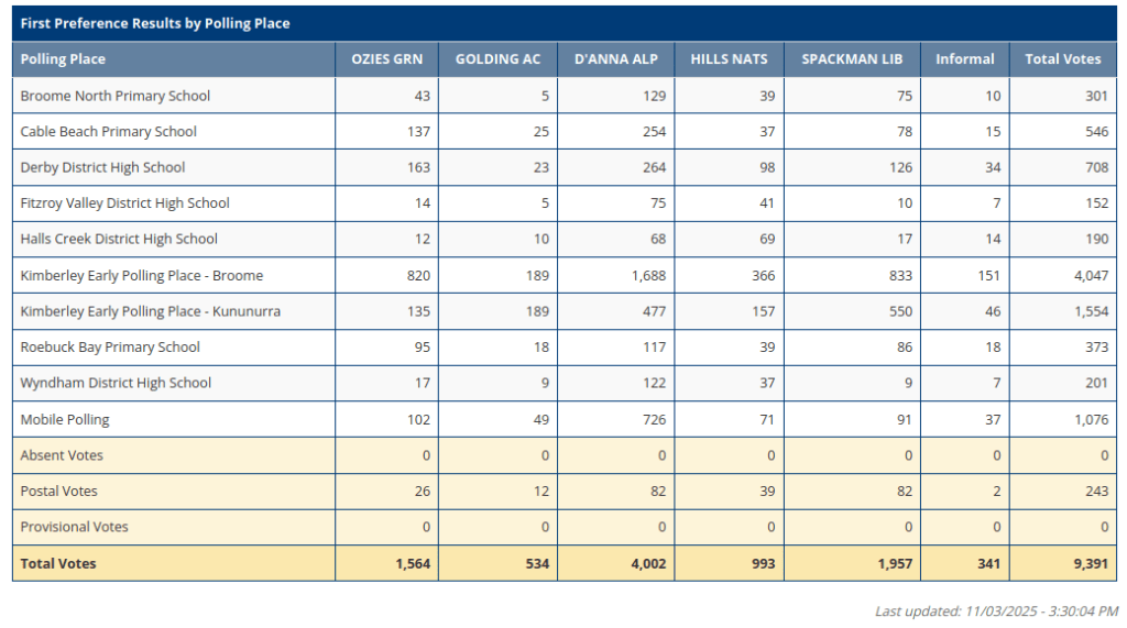 In the Legislative Assembly seat of Kimberley, Divina D’Anna (ALP) was reelected with a -9.8% TPP swing against her to land on a margin of 61. 7% (TPP) and a first preference vote of 44.2% with 50.9% of votes counted.
